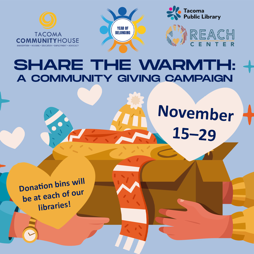 From Nov. 15-29, Tacoma Public Library is partnering with Tacoma Community House to collect items for a Winter Weather Essentials Drive supporting community members during the cold season.